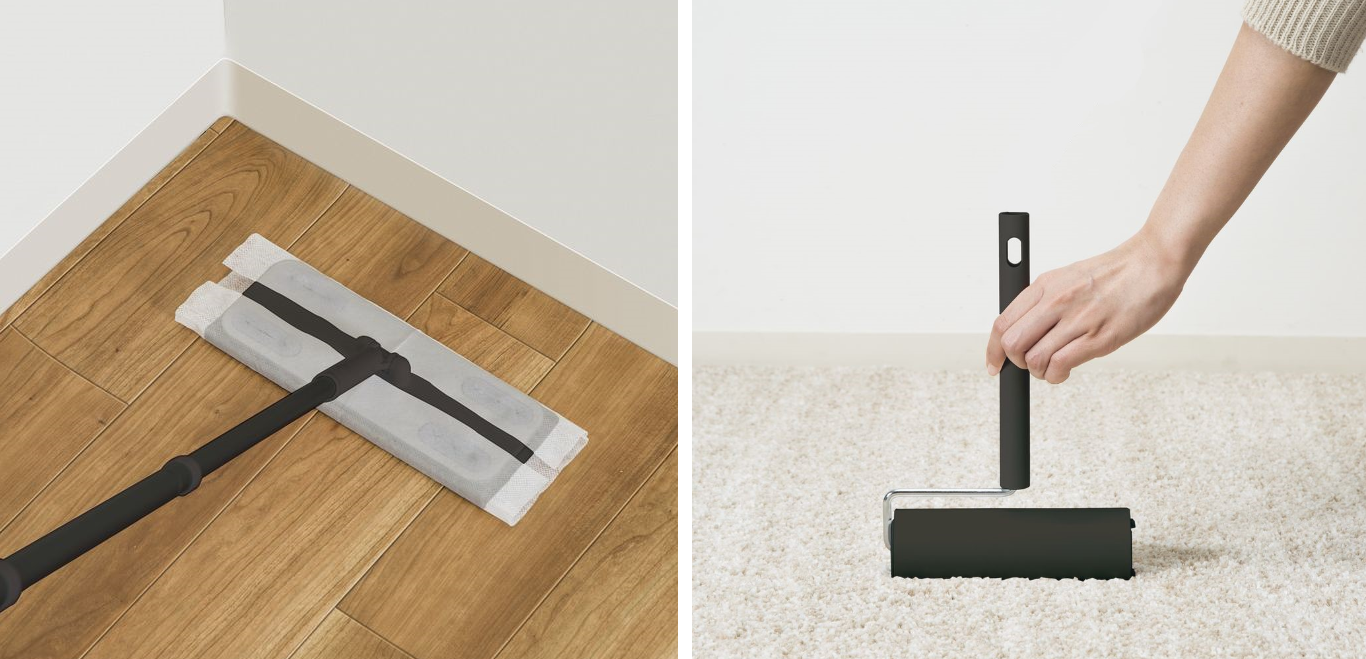 従来、掃除用品はホワイト中心の品揃えでしたが、インテリアに馴染んで生活感も出にくいブラックを好まれるお客様の声にお応えし、ブラック色を追加いたしました。定番アイテムのフローリングワイパー本体や収納するスタンド、カーペットクリーナー本体とスペアテープの4アイテムをご用意しています。