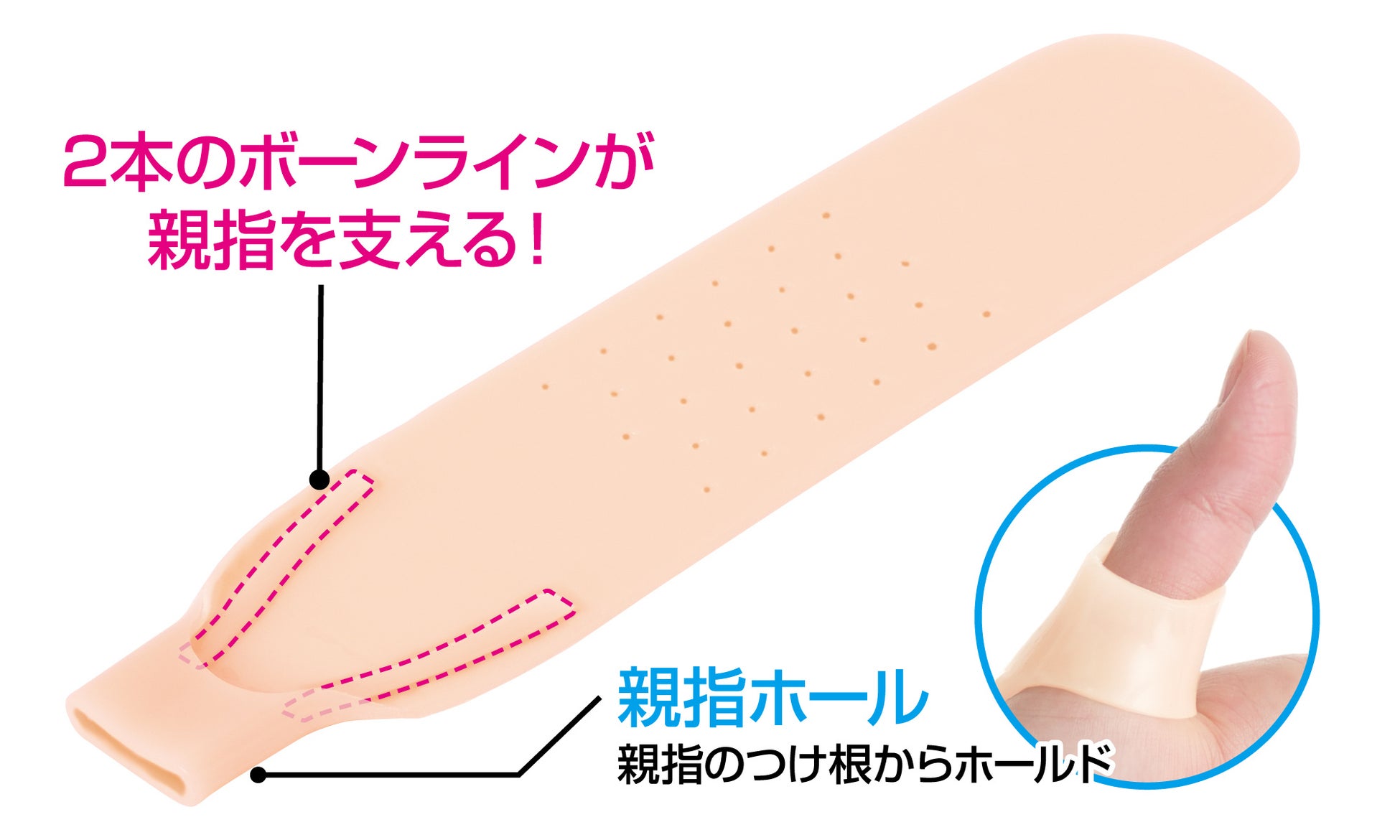 伸縮性に優れた薄くて軽いゲル素材で、曲げ伸ばしやすく、手指を動かしてもズレにくい。