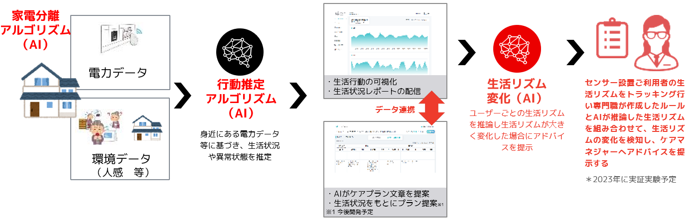 独居高齢者の居宅内に電力センサー等を設置。家電を利用する際の電力データを基にAI技術を用いて高齢者の生活行動を推定し、その生活リズムを可視化。生活リズムが逸脱したときのアドバイスや定期レポートで、日々の生活をサポートするシステム。