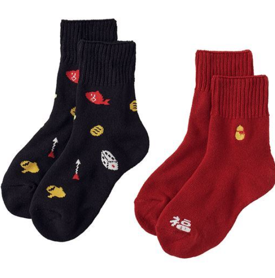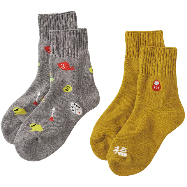開運にまつわる10個のモチーフを散りばめた、新年ムード満開のソックス。肌側は全面パイル仕様でふかふかとした踏み心地。年末年始のご挨拶や、身近な方への贈り物にもおすすめです。