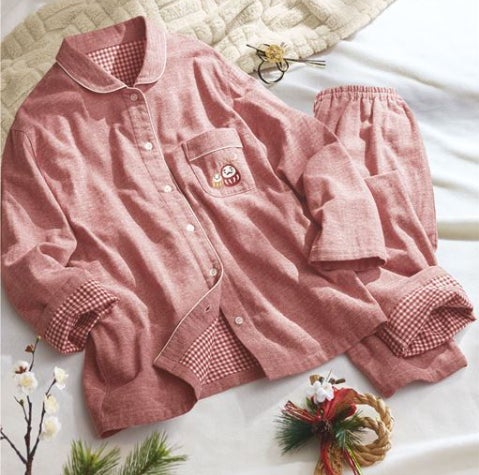 赤い身生地と胸元のだるま刺繍で開運祈願を込めたシャツパジャマです。綿100%のあったかガーゼ素材で、適度な湿度と温度が保ち朝まで快適に眠れます。
