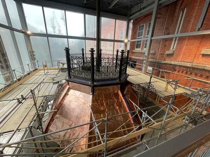 なお、現在仮設見学施設では、新たな銅板に葺き替えられ赤褐色に輝く八角塔の屋根をご覧いただけます!