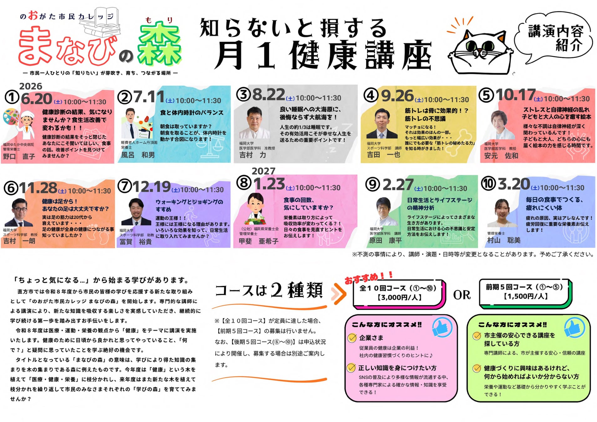 直方市では、市民の学びを体系的に支える新たな取り組みとして、「のおがた市民カレッジ まなびの森」を令和8年度より開講します。その第1弾として、「知らないと損する月1健康講座」を開催します。