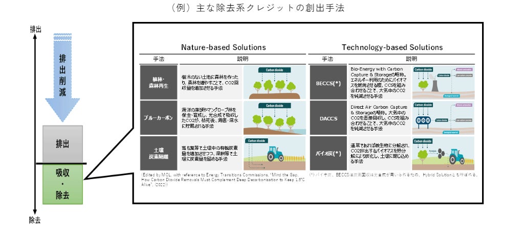 ※:除去系クレジットとは大気中からCO2を直接除去する手法に基づくカーボンクレジット。その手法は大きく分けて「自然系」と「技術系」に分類される。自然系では植林・再植林・土壌炭素貯留等、技術系では大気中のCO2を直接回収し、地中に貯留するDACCSやバイオマス発電とCO2を地中に貯留するCCS技術を組み合わせたBECCS等が該当する。