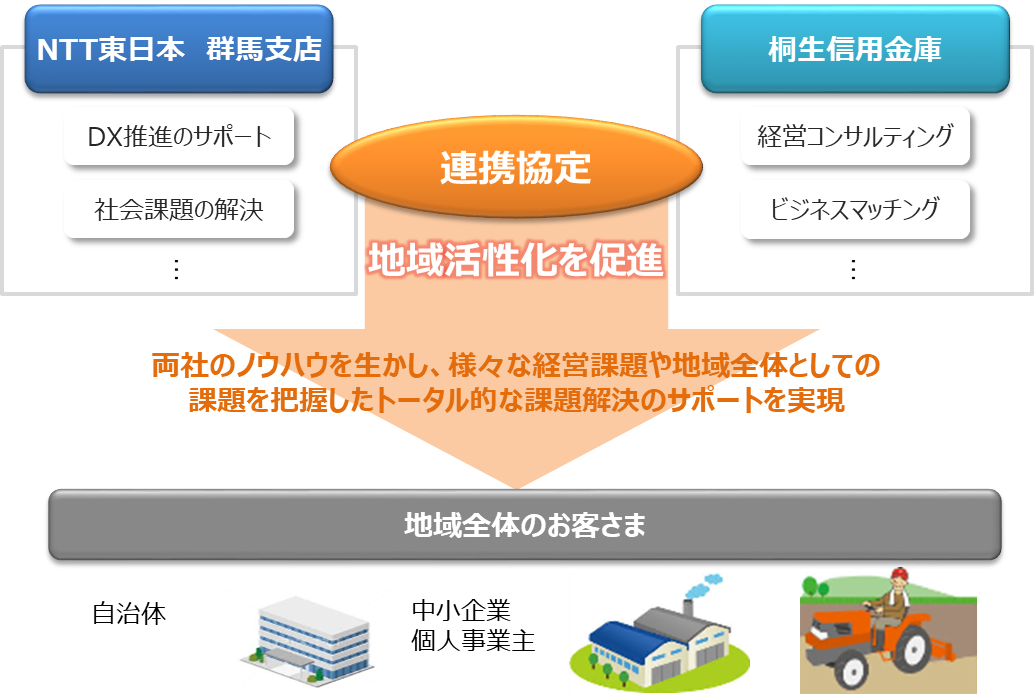 桐生信用金庫(代表理事:津久井 真澄)と東日本電信電話株式会社 群馬支店(支店長:橋本 寿太郎、以下「NTT東日本」)は、ICTを活用した地域社会の発展と活性化に向け、多分野において連携および協力するために協定を締結します。