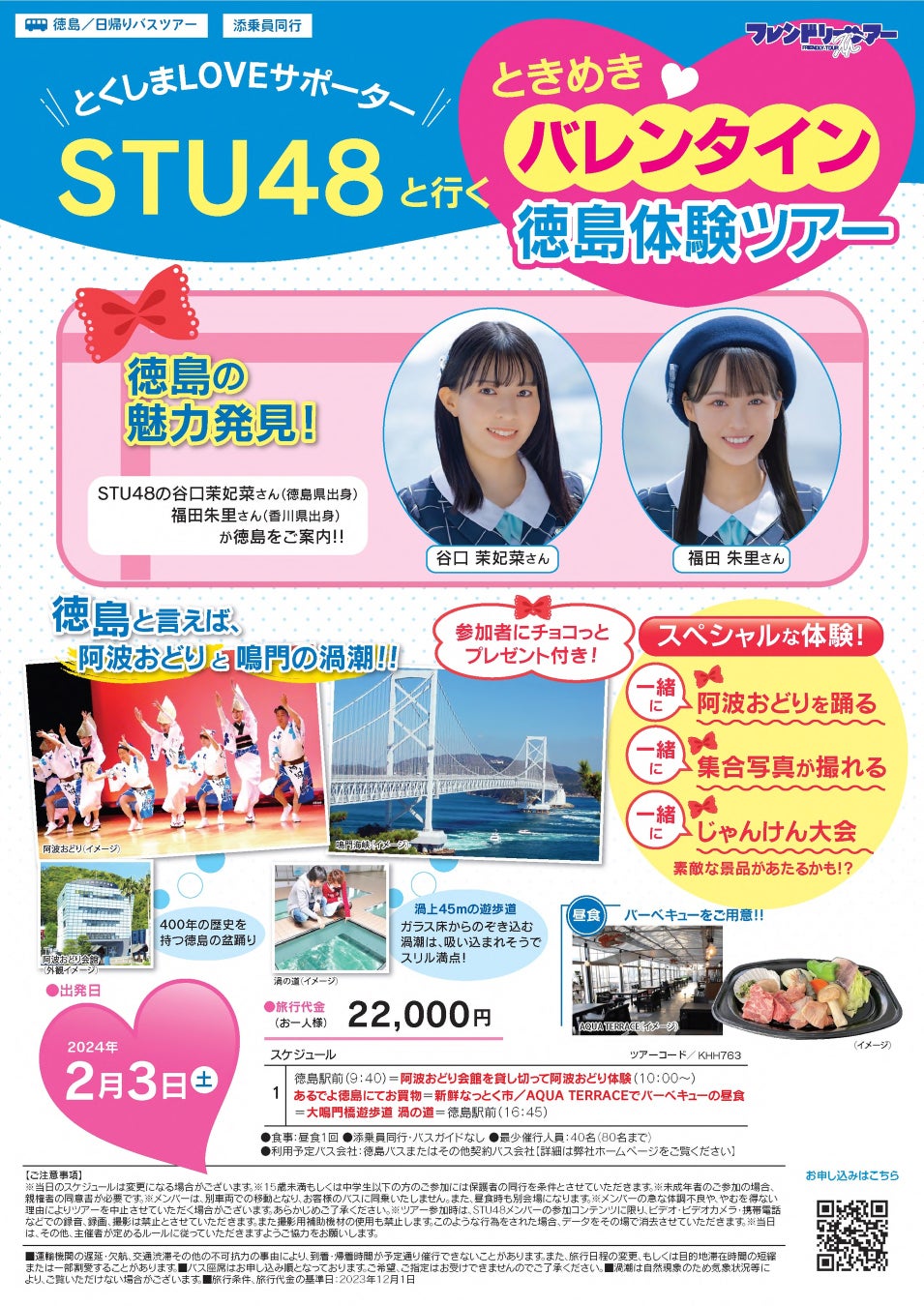 徳島県の魅力をSNS 等で発信する 「とくしまLOVE サポーター」に就任いただいている、STU48 の谷口茉妃菜さん、福田朱里さんと巡るバレンタインバスツアーの参加者を募集します。