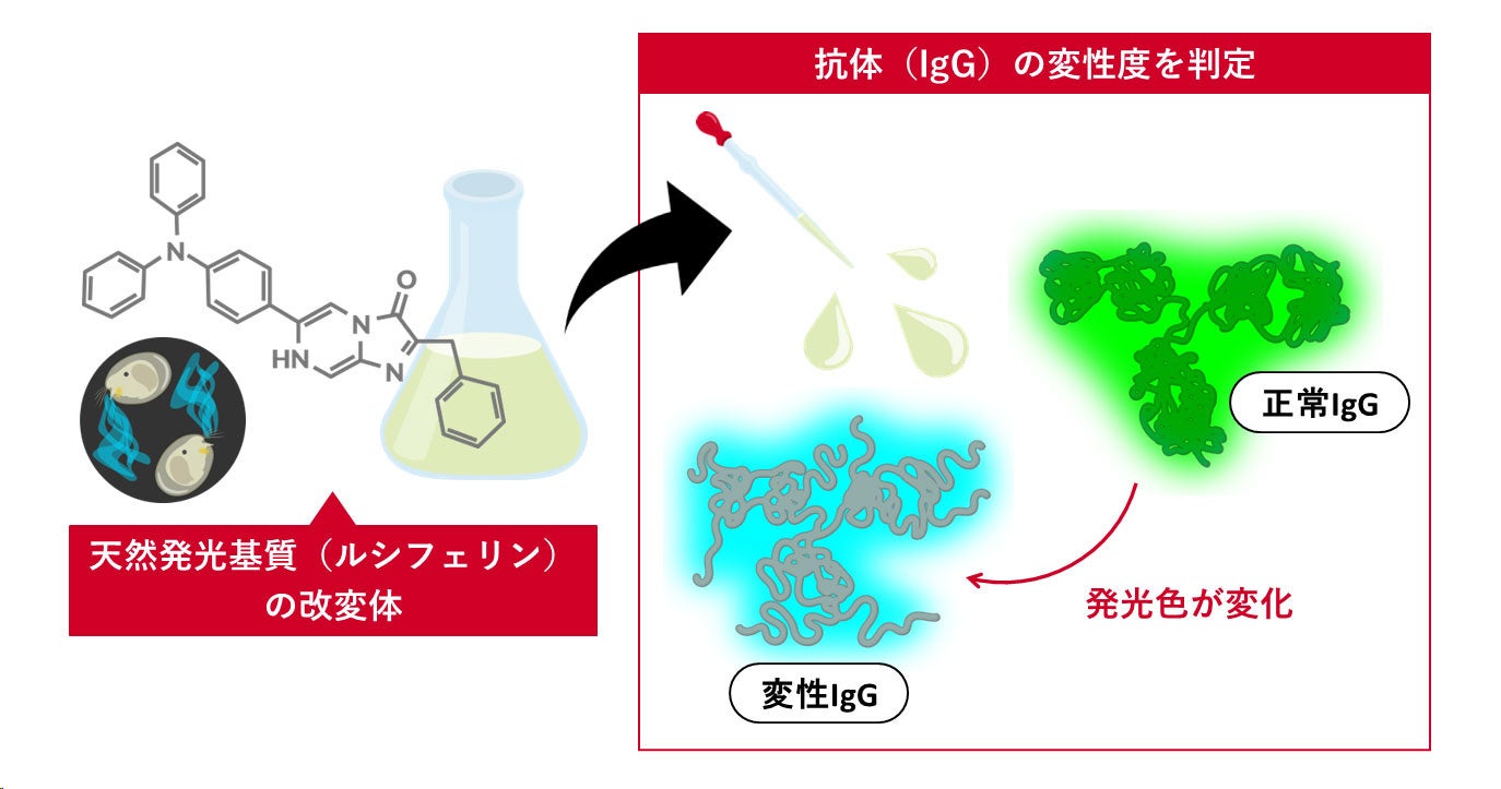 本研究では、抗体の一種であるIgGがルシフェリンの発光反応を触媒する「擬似ルシフェラーゼ活性」を持つことを初めて発見しました。また、それを利用したIgGの変性検出技術を開発しました。この新規に設計、合成したルシフェリンの発光波長はIgGの構造に応じて変化するため、これを測定することでIgGの変性度を簡便かつ定量的に評価できます。本手法は従来の蛍光分析法よりも高い感度を持ち、開発したルシフェリンを混合するだけで3分以内に測定が完了するため、IgGに関連した抗体医薬品の品質管理や診断薬開発への貢献が期待できます。