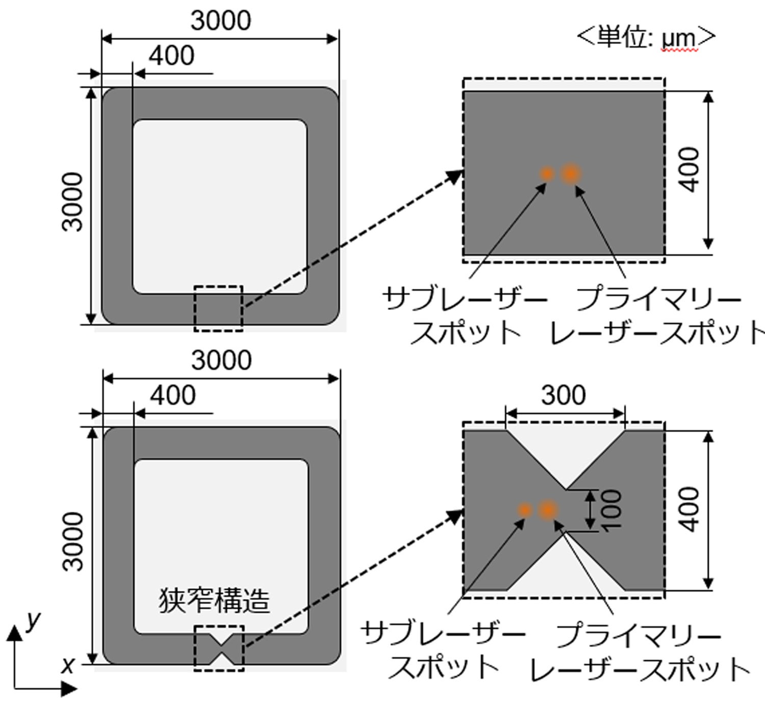 光を吸収して熱に変換する特性を持つ厚さ0.1µmのFeSi2薄膜(※7)とレーザー光を用いて、この薄膜上にバブルを生成するためのレーザー照射点(プライマリーレーザースポット)と、温度分布を制御するためのレーザー照射点(サブレーザースポット)を設定し、エタノール水溶液の流路内部に、内部が高温蒸気で満たされた直径10µmのマイクロバブルを生成しました。このバブルによって生じた駆動力のみで、従来のEHDポンプ(※8)を用いた場合と同等の流速100µm/sを実現し、断面の寸法が100µm×400µm、一辺3mmの正方形の流路内で流れを循環させることで、数ミリメートルの流れを生成することに世界で初めて(※1)成功しました。