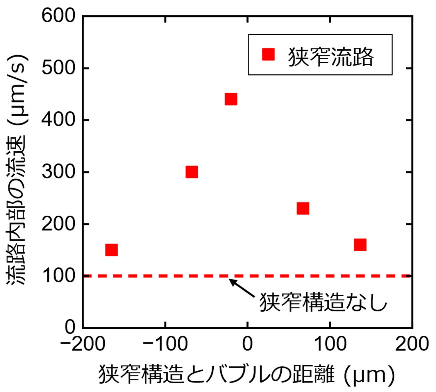 さらに、流路内部に断面積が局所的に小さくなる狭窄構造を設け、バブル周辺に生成される渦を制限することで、バブルによって生成された流れの大部分を流路の進行方向へ流すことが可能となり、流速を約440µm/sまで向上させることに成功しました。