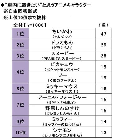 “車内に置きたい”と思うアニメキャラクターを聞いたところ、1位「ちいかわ(ちいかわ)」(47名)2位「ドラえもん(ドラえもん)」(29名)、3位「スヌーピー(PEANUTS スヌーピー)」(25名)、4位「ピカチュウ(ポケットモンスター)」「プー(くまのプーさん)」(いずれも19名)となりました。