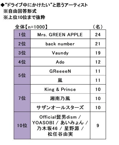 ◆ドライブ中にかけたい音楽 1位「Mrs. GREEN APPLE」2位「back number」