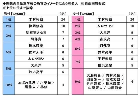 ◆理想の自動車学校の教官のイメージに合う有名人 男性・女性回答とも1位「木村拓哉さん」