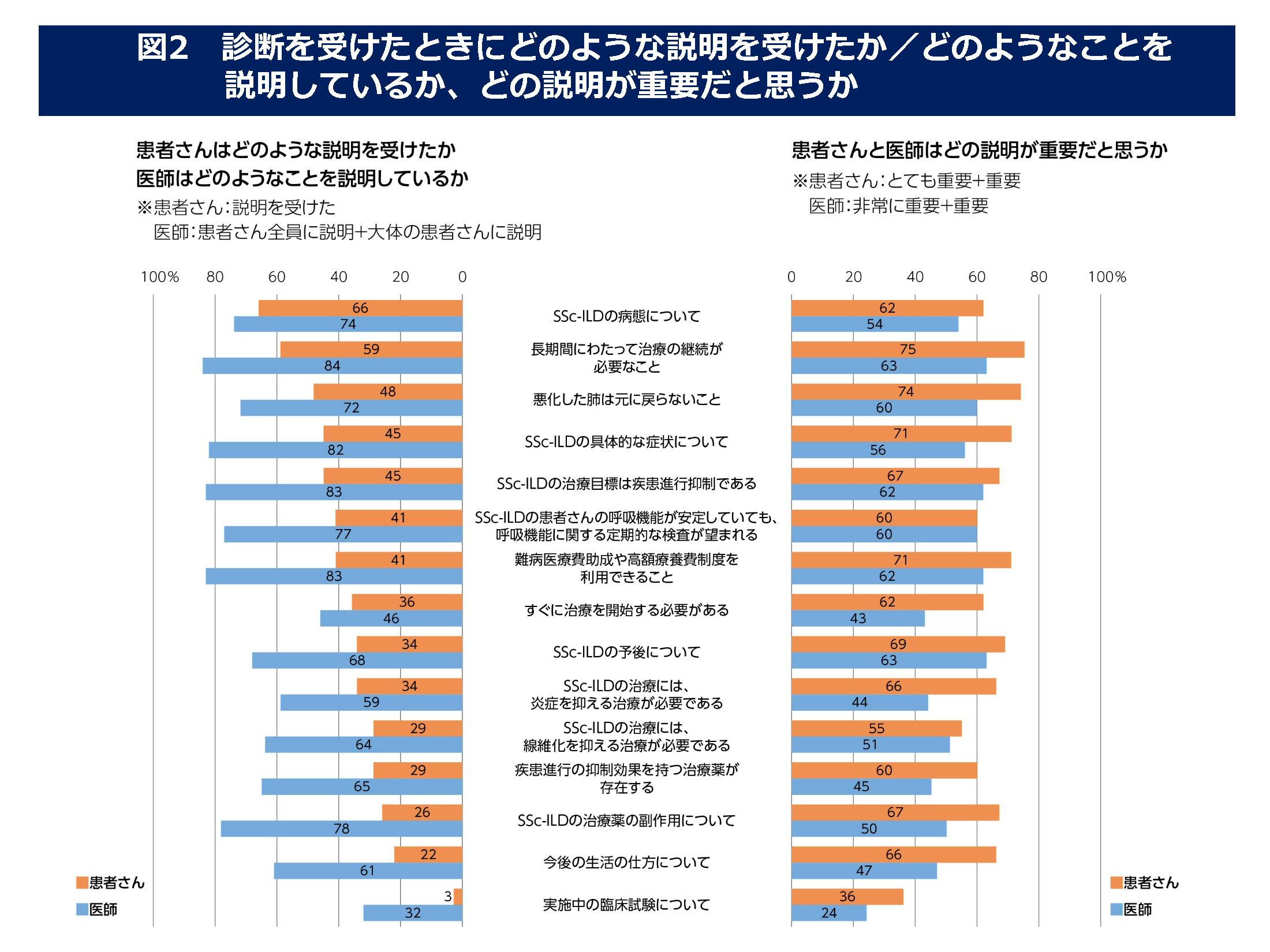 SSc-ILD診断時、患者さんの約8割が「不安」を感じ、医師からの説明で半数以上の患者さんが覚えていたのは「病態」「長期間の治療」の2項目