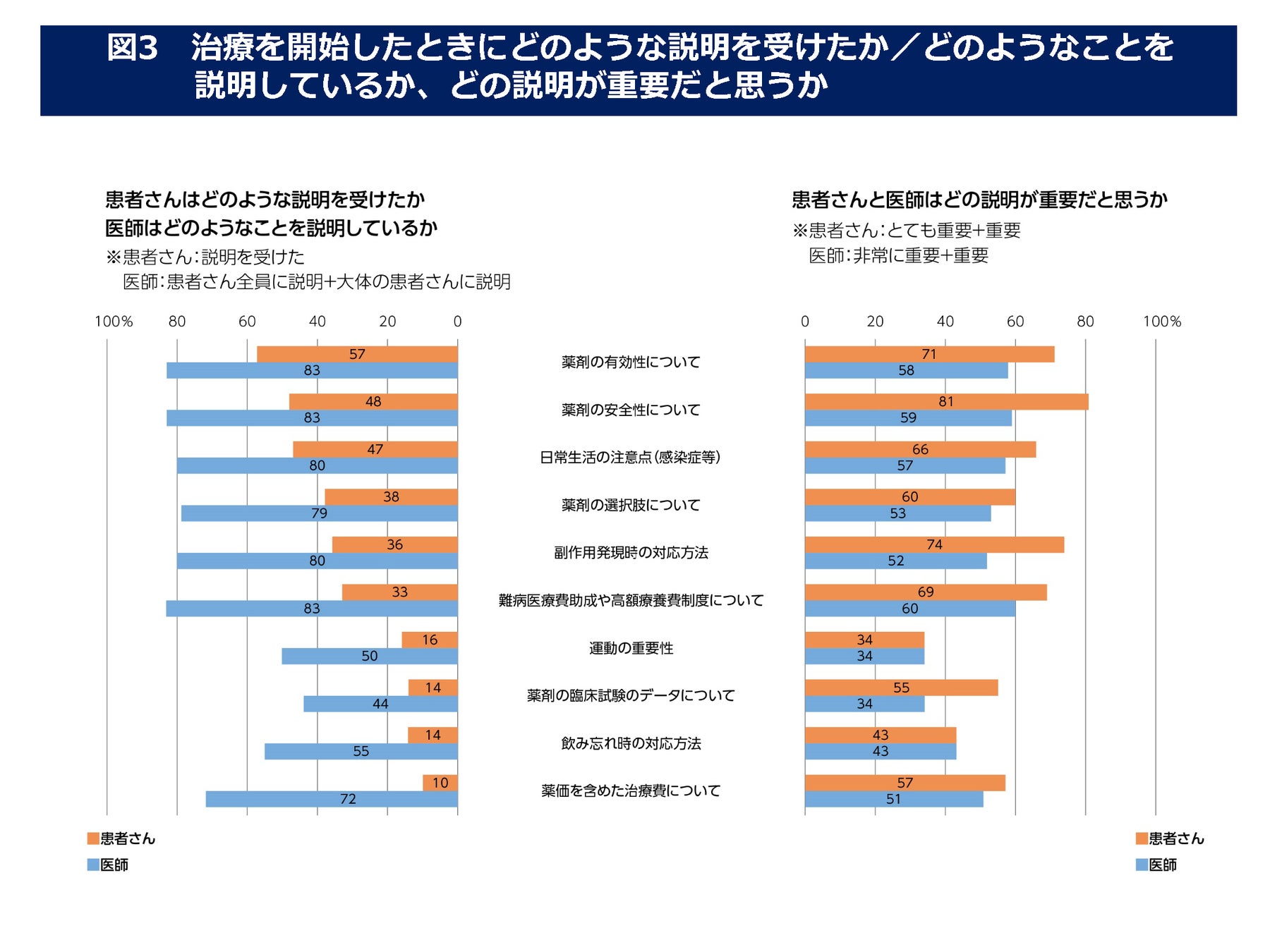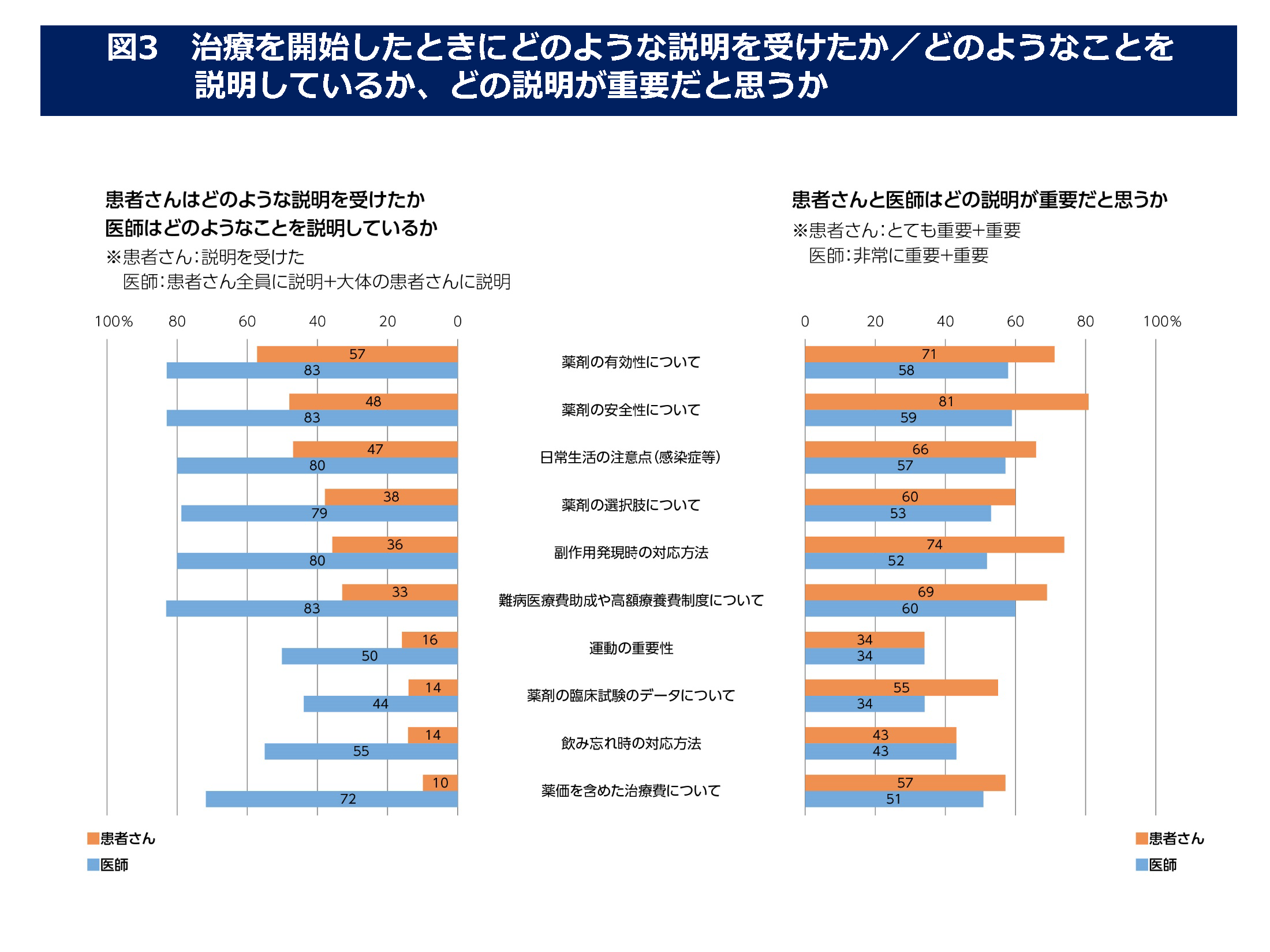 治療開始時の医師からの説明として、半数以上の患者が医師の「説明を受けた」ことを覚えているのは「薬剤の有効性」でした。(図3)