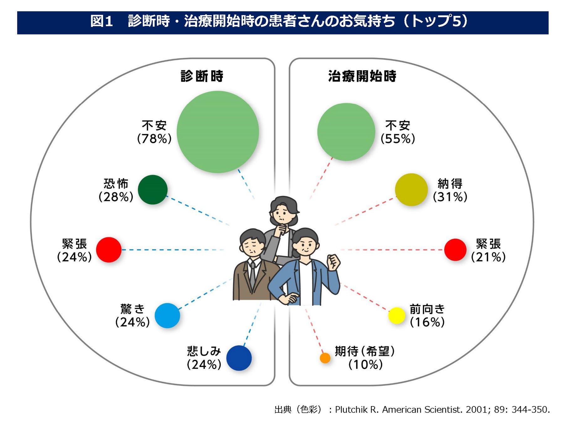 -診断時に患者さんの約8割が「不安」を感じており、治療開始時に「不安」を感じていた患者さんは約半数(図1)