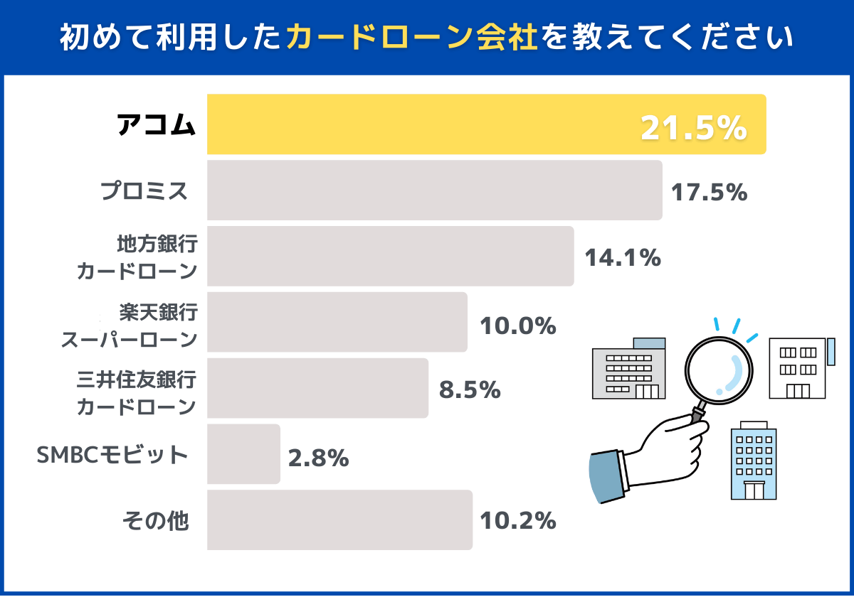 初めて利用したカードローン会社の1位は21.5%の「アコム」でした。