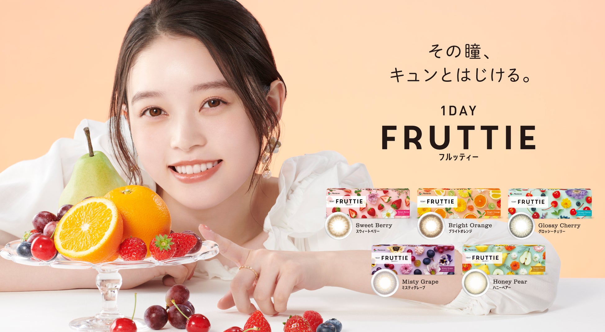 『1DAY FRUTTIE』は、「元気とみずみずしさがあふれる瞳」をコンセプトに、丸くて、愛らしくて、みずみずしいフルーツのような瞳をイメージしたカラーコンタクトレンズとして2020年に発売し、2023年には2色を追加して、現在5色のラインアップにてご好評をいただいております。