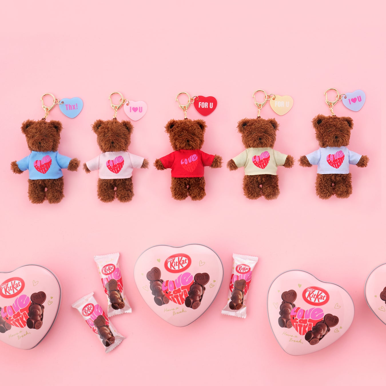 バレンタインシーズンにぴったりの「キットカット ハートフルベアー」のハッピーでキュートなデザインを取り入れたタンブラーやクッションがラインアップ。さらに、5色からお好みのカラーを選べるぬいぐるみキーホルダーとトートバッグも登場し、大切な人へのギフトや自分へのご褒美としてバレンタインを盛り上げるアイテムが揃います。