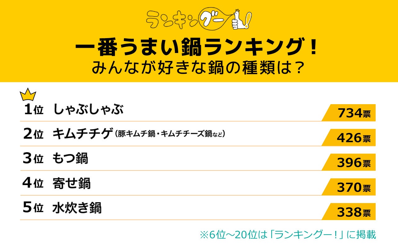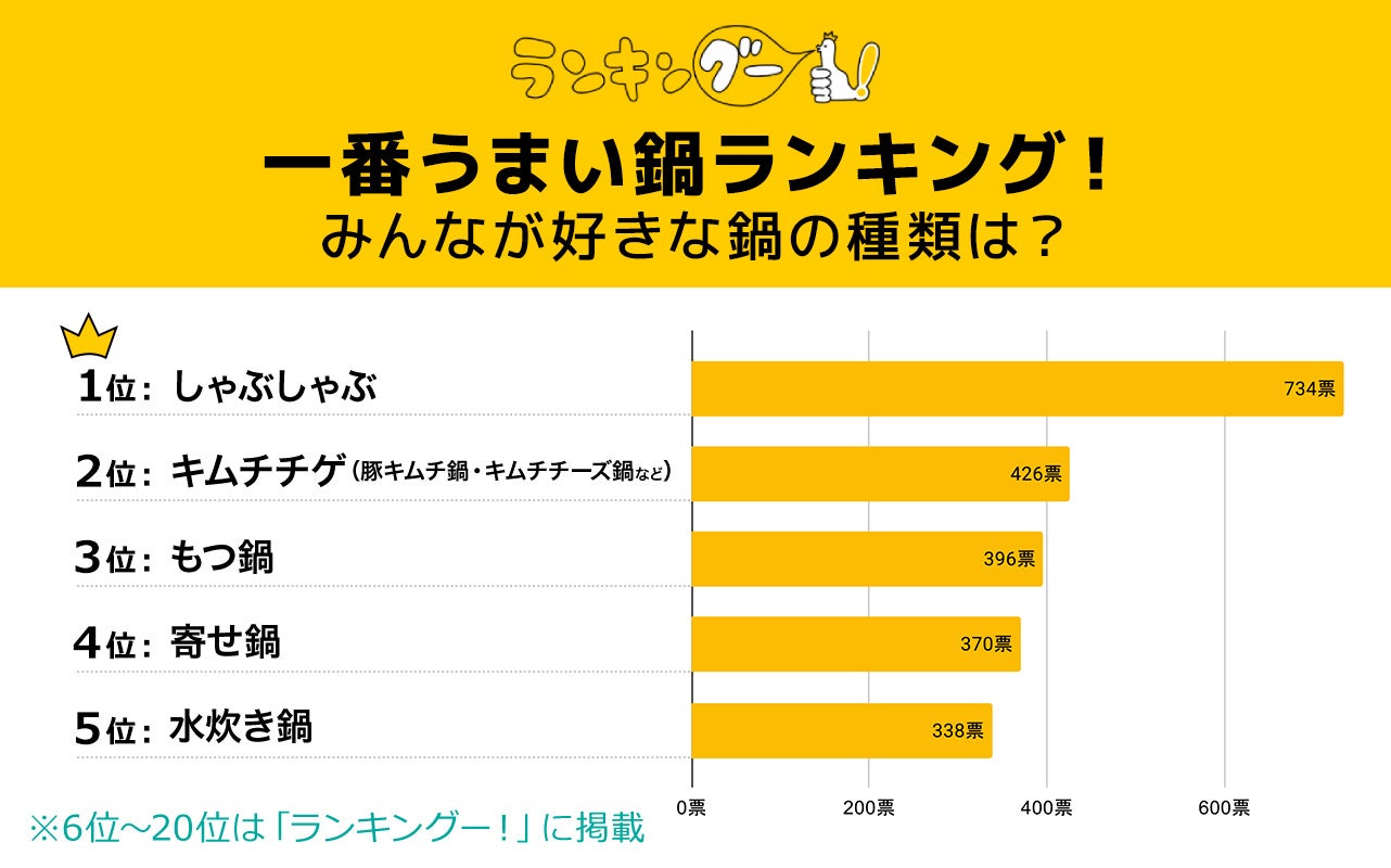 ランキングー!では一番おいしいと思う鍋ランキングを調査。10~50代の男女(性別回答しないを含む)5,869名にアンケートを行い、TOP20を決定しました。ここではTOP5をご紹介します。