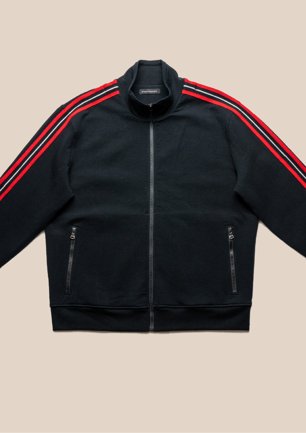 レッドとブラックを基調にしたシャープな色使いながらもリラックスした素材感と着心地で気負わずエフォートレスなスポーティスタイルに仕上げます。