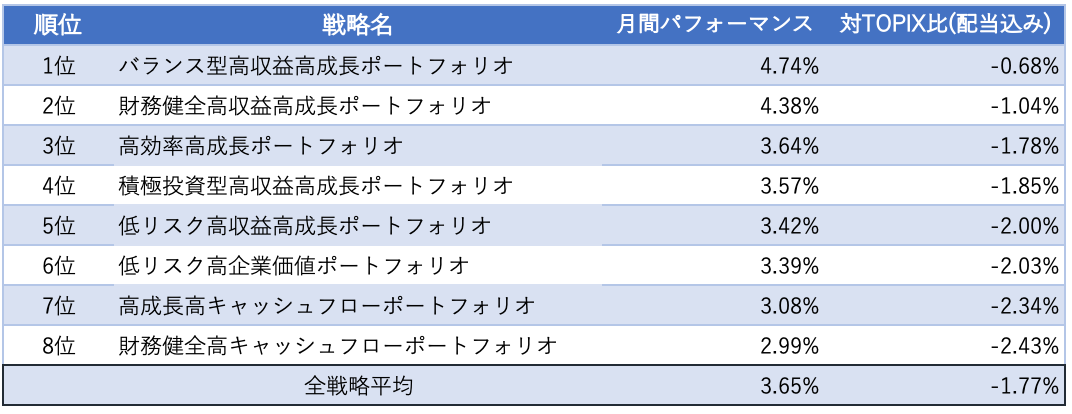 Wealth Wingがご提供する全8戦略の平均運用成績は、月間で+3.65%、対TOPIX比で-1.77%となりました。