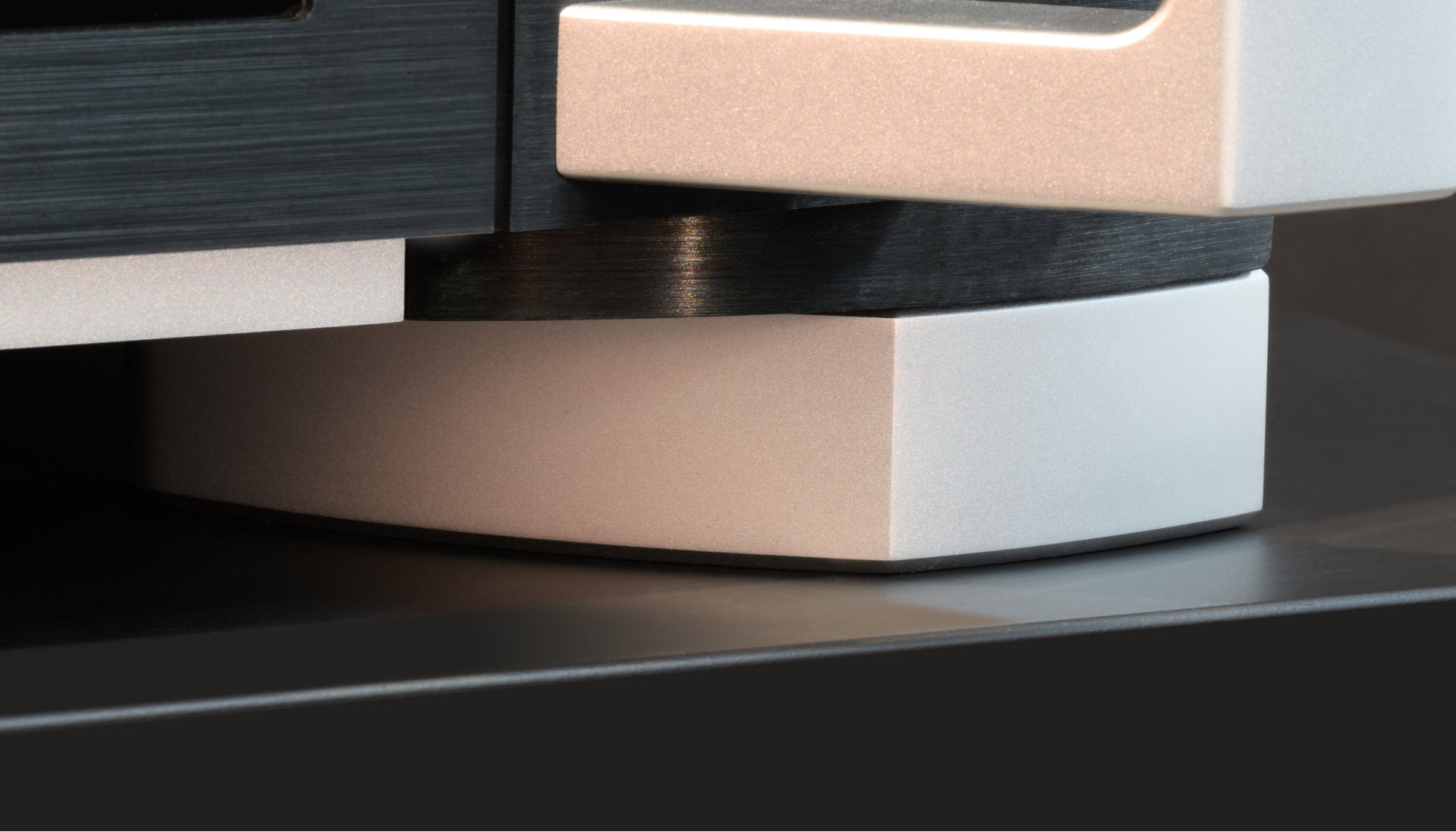 本体シャーシの4隅すべてに振動を減衰する防振アイソレーション・フィートを搭載。不要な振動を本体から排除することはもちろん、本体を設置面から持ち上げることにより、左右の外部ヒートシンクと合わせて対流冷却を強化。オーディオパフォーマンスの向上と安定した動作環境を提供します。