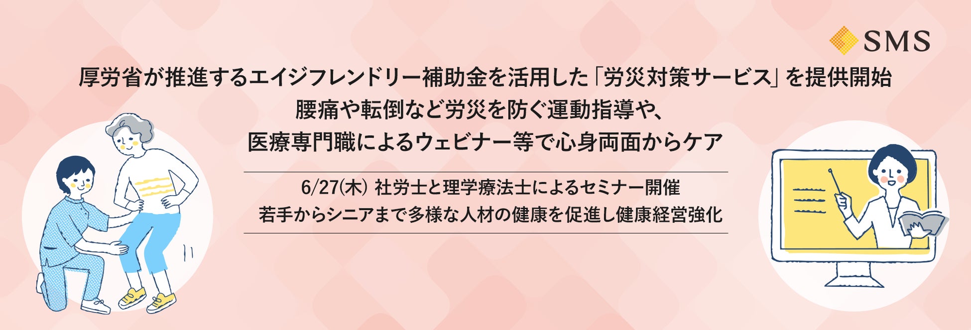 厚労省が推進するエイジフレンドリー補助金を活用した「労災対策サービス」を提供開始。腰痛や転倒など労災を防ぐ運動指導や、医療専門職によるウェビナー等で心身両面からケア