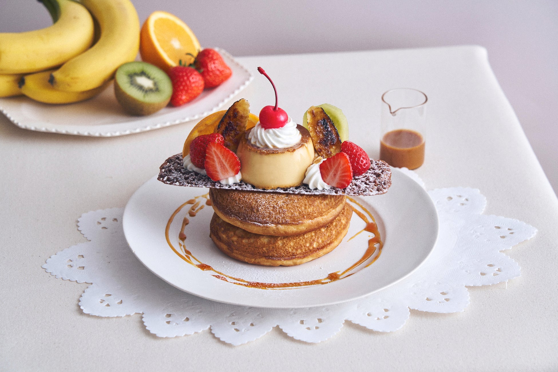◆ どこか懐かしい気持ちになる思い出の味。レトロなクラシックプリンとパンケーキのスペシャルハイブリッド!心も躍り出すプリンアラモードパンケーキが新登場