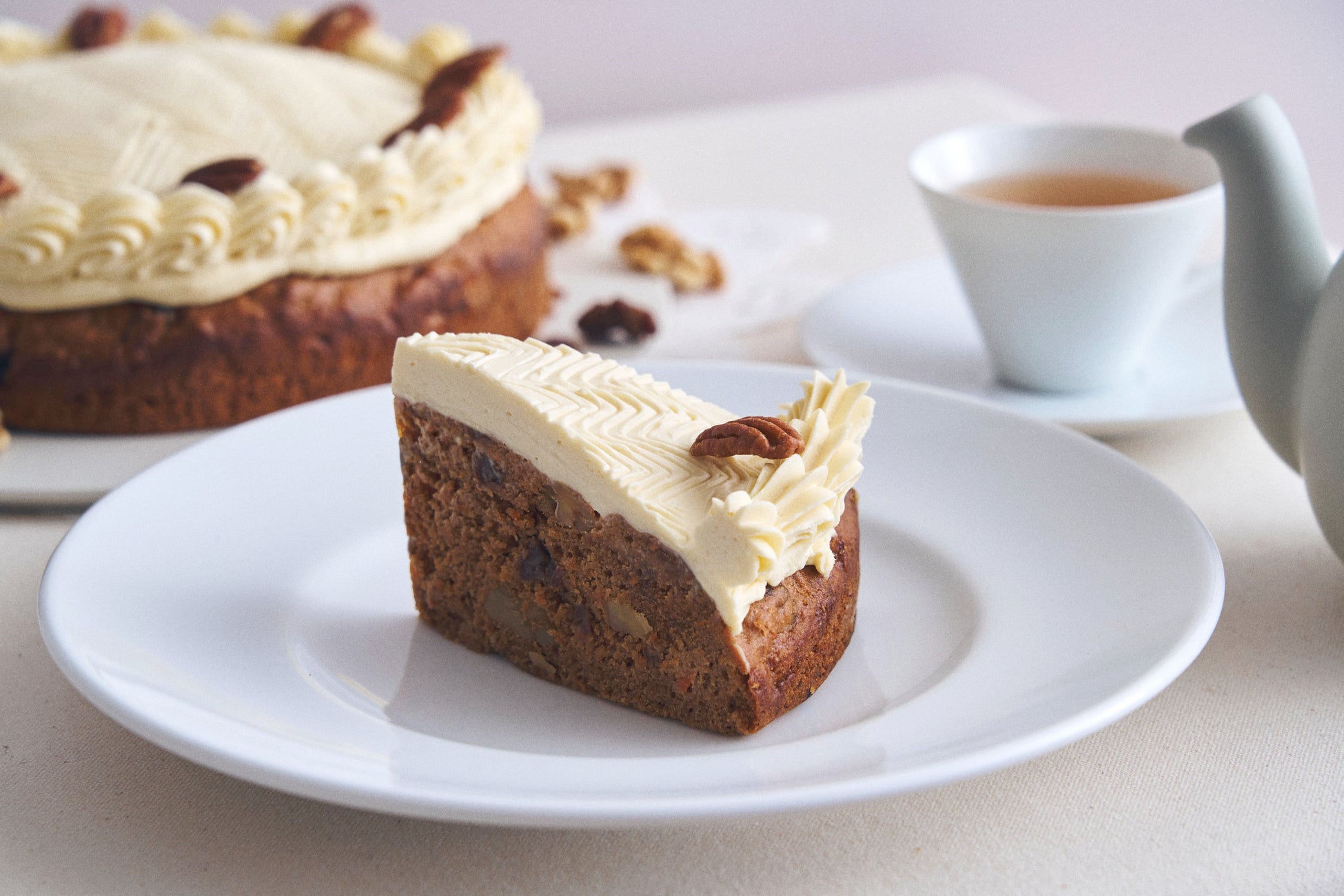 たっぷりのくるみとレーズンを混ぜ合わせたクラシカルなキャロットケーキ。きび砂糖を使用する事でやさしい甘さに仕上がり、シナモンとナツメグのスパイスを感じながらもコクのあるクリームチーズフロスティングが全体を一つにまとめています。