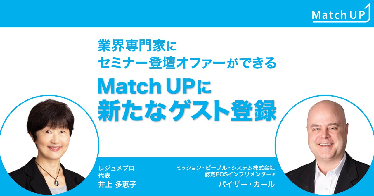 業界専門家にセミナー/イベント登壇のオファーができる「Match UP」レジュメプロの井上 多恵子氏、ミッション・ピープル・システム株式会社のパイザー・カール氏などが新たにゲスト登録!