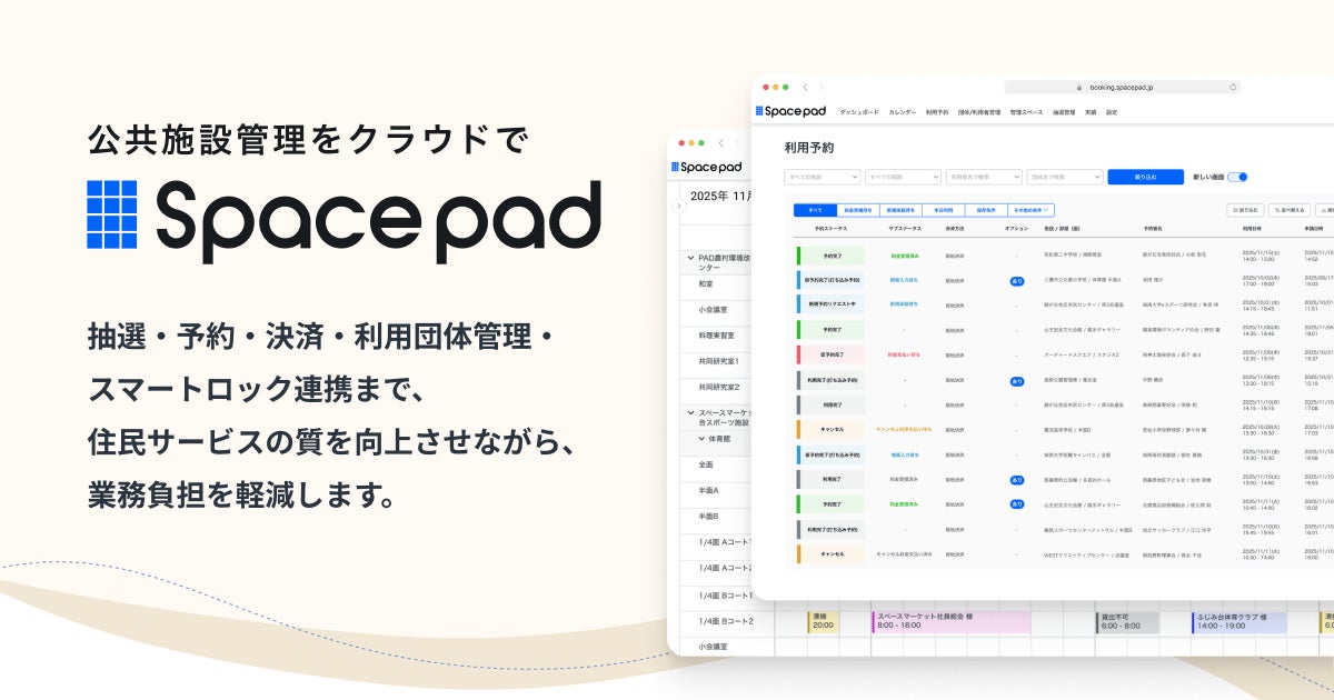 Spacepadはあらゆる施設の予約や管理をデジタル化し、煩雑な施設管理業務を簡易化する、クラウド型予約管理システムです。公共施設等の予約ページをオンラインで作成し、キャッシュレス決済、団体・会員情報の管理、減免料金の計算、予約管理までワンストップで簡単に行えます。これにより多数の施設管理を行う自治体等のDXを実現します。詳細はこちら:https://booking.spacepad.jp/