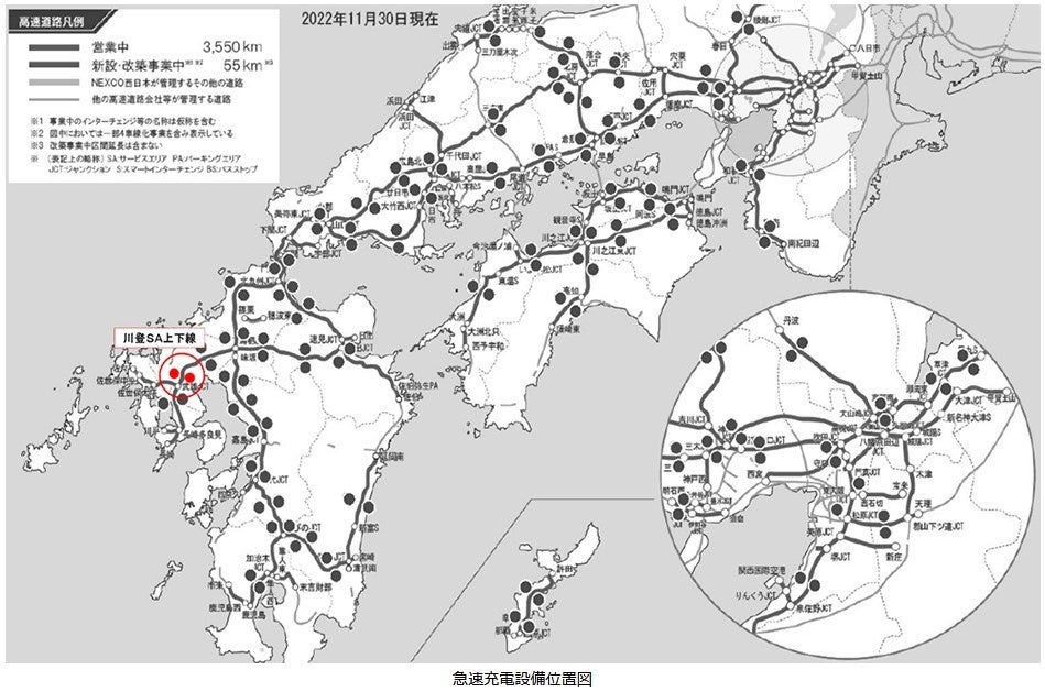 NEXCO西日本九州支社(福岡市博多区、支社長:中村 順)は、電気自動車(EV)急速充電設備をご利用のお客さまの更なる利便性向上を目的として、2月13日(月曜)より E34 長崎自動車道 川登サービスエリア(SA)(上下線) において新たに充電サービスを開始いたします。
