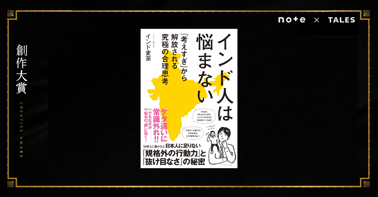 日本最大級の創作コンテスト「創作大賞2024」ビジネス部門で入選を果たした、インド麦茶さんの作品が書籍化。受賞作に改稿を重ね『インド人は悩まない 「考えすぎ」から解放される究極の合理思考』として、ダイヤモンド社から発売されました。