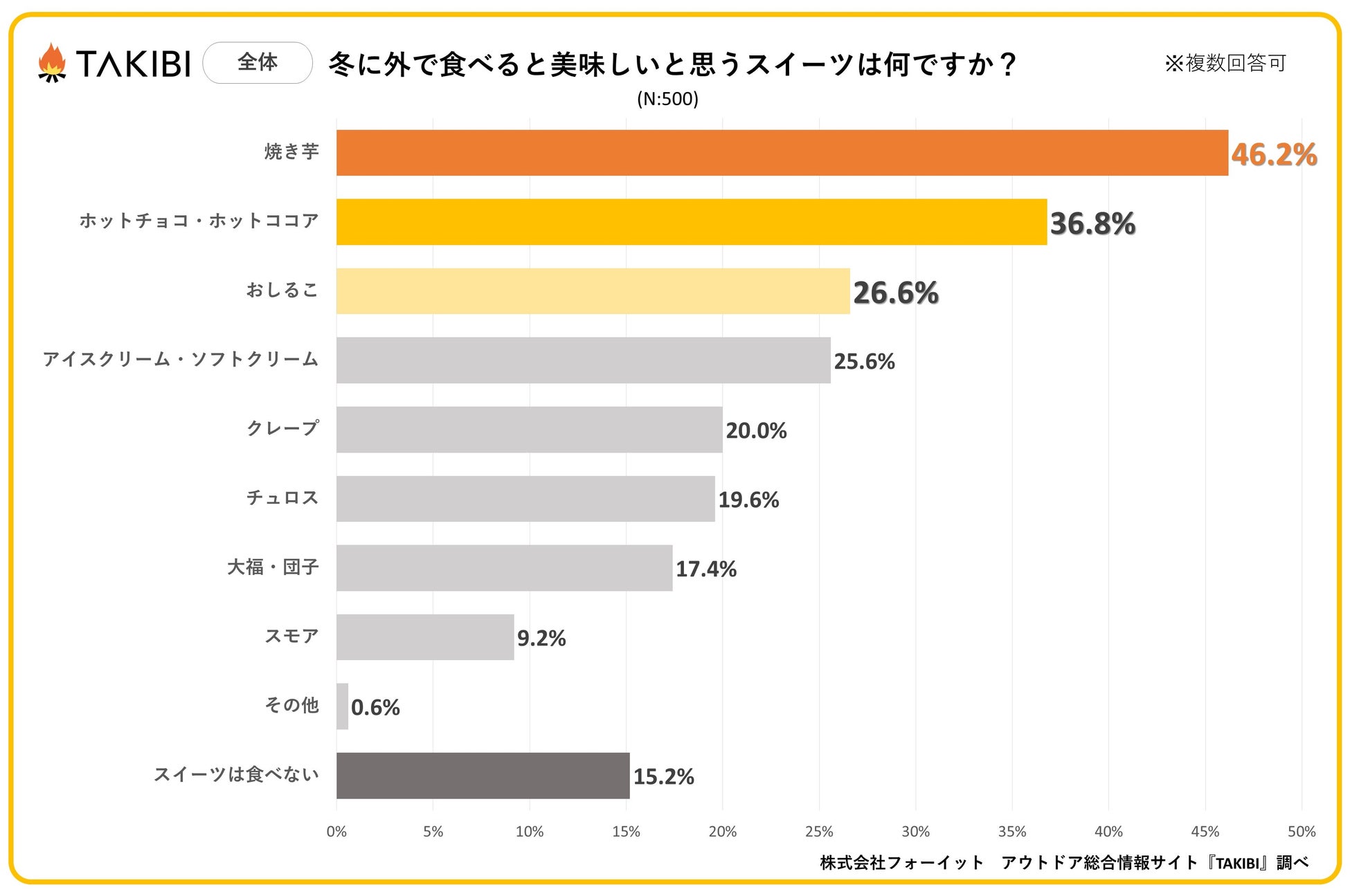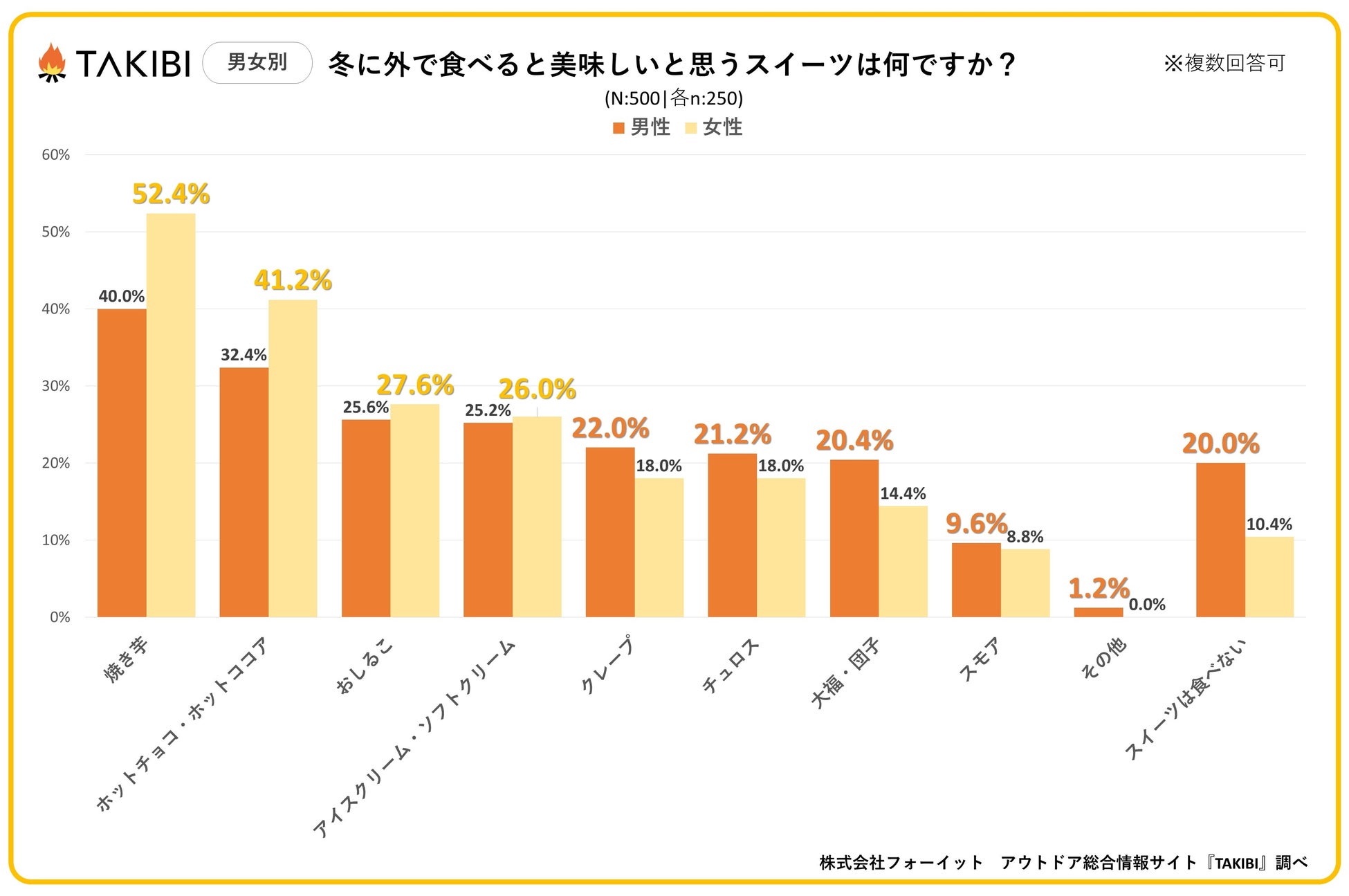 キャンプやグランピングを中心としたアウトドア総合情報サイト「TAKIBI」の運営をおこなう株式会社フォーイットは、全国の10代~50代までの男女500人を対象に冬のスイーツに関するアンケートを実施し、男女別・年代別等の特徴についてまとめました。