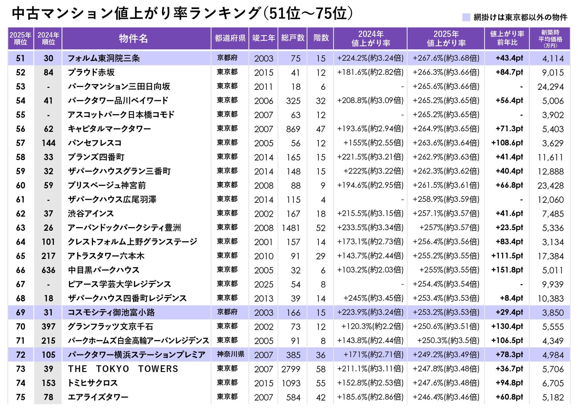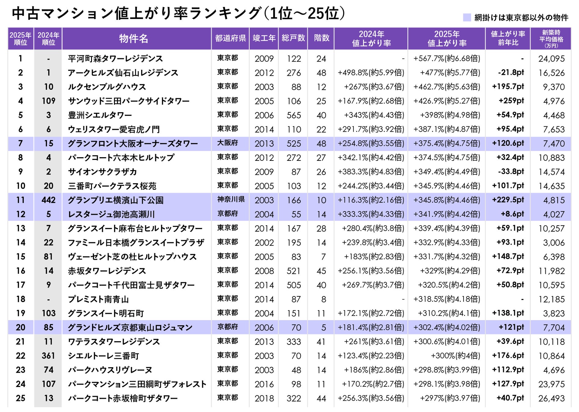 2025年中古マンション値上がり率ランキングTOP100都心部を中心に価格高騰が加速、資産価値が倍増した物件も