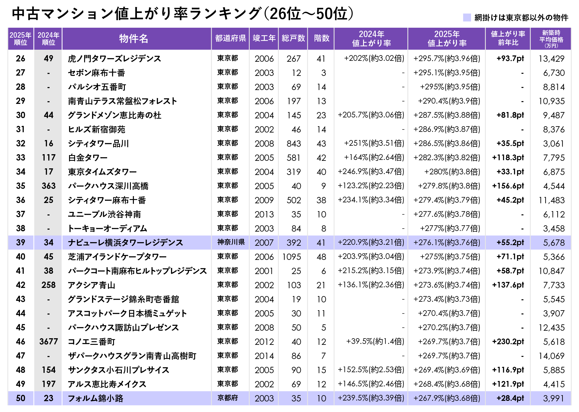 2024年と比較し、値上がり率が100ポイント以上上昇した物件が27物件ありました。さらに200ポイント以上上昇した物件も3物件あり、前年比で下落した物件は上位100物件中2物件しかありませんでした。2024年も不動産相場が大きく上昇した年でしたが、2025年はさらに大きく相場が上昇したことが分かります。