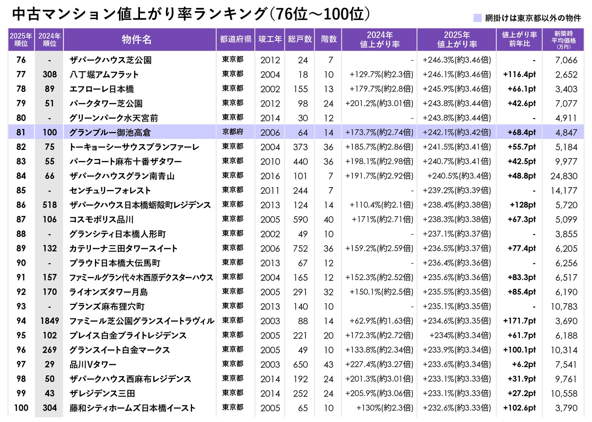 今回は2025年に中古市場へ流通した物件が、分譲時から平均してどの程度値上がりしたのかを算出し値上がり率が高かった上位100物件をランキング形式でまとめました。