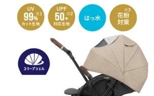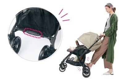 大型の幌ですっぽり覆い、日差しなどから赤ちゃんを守る。