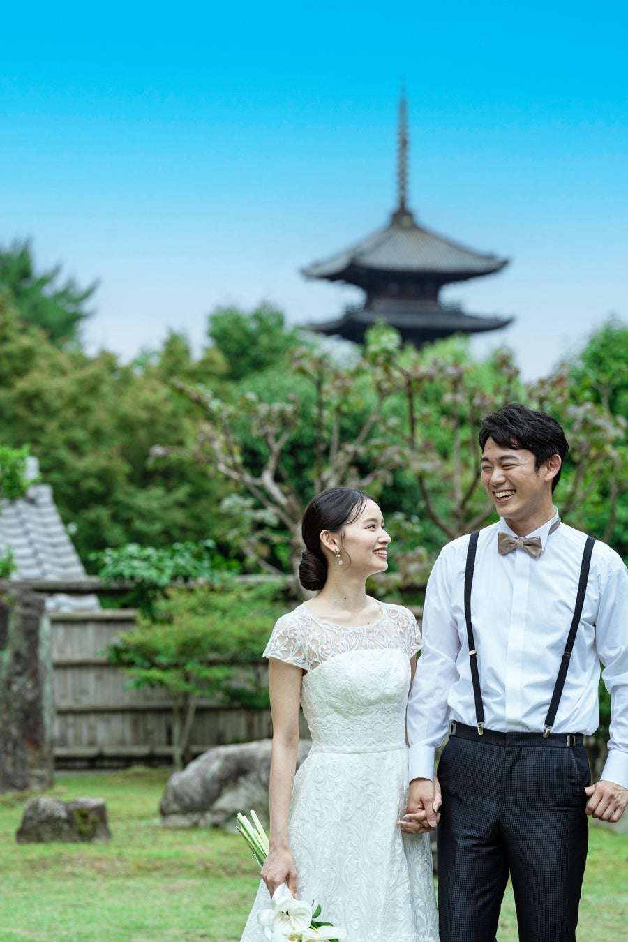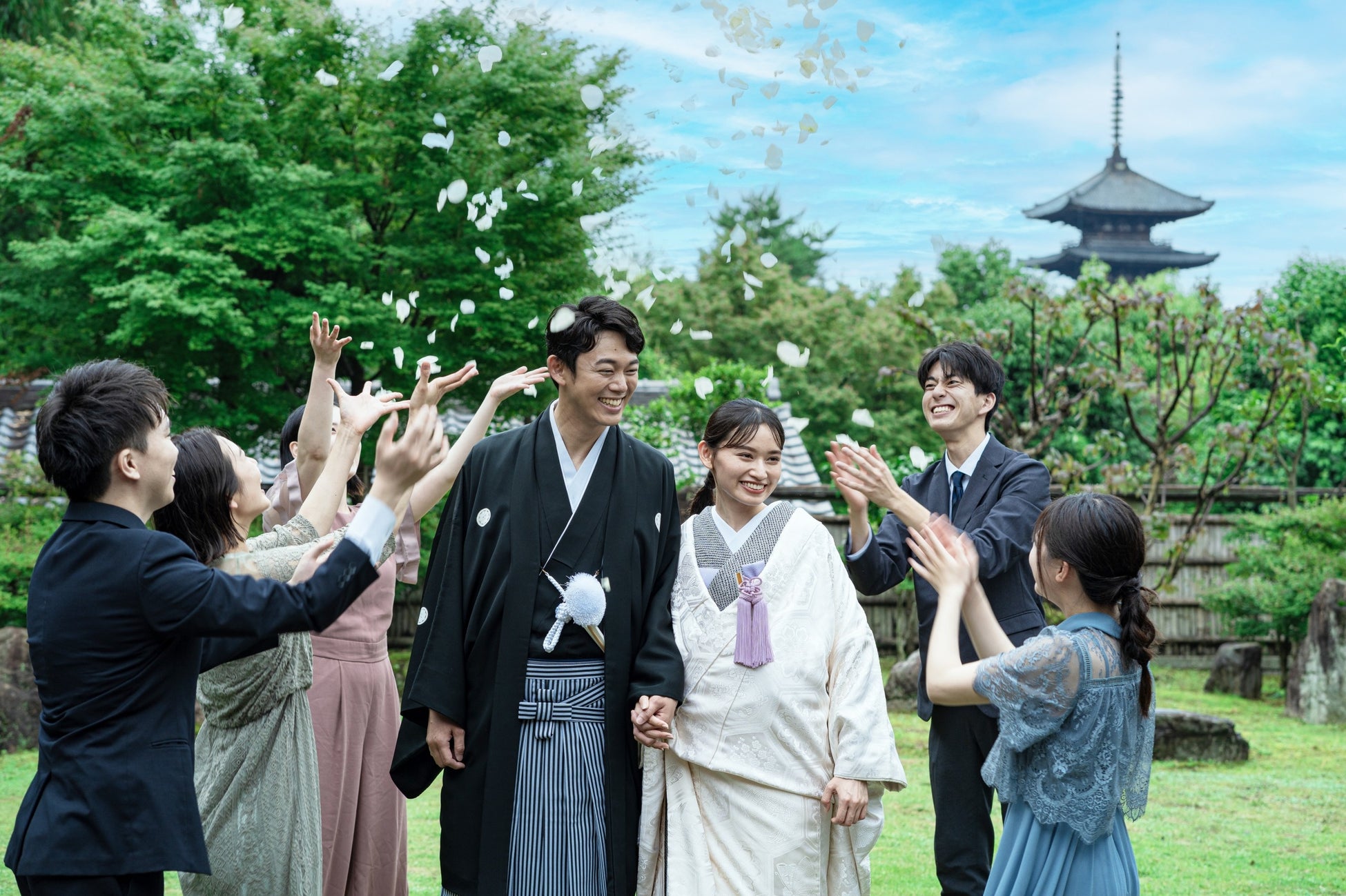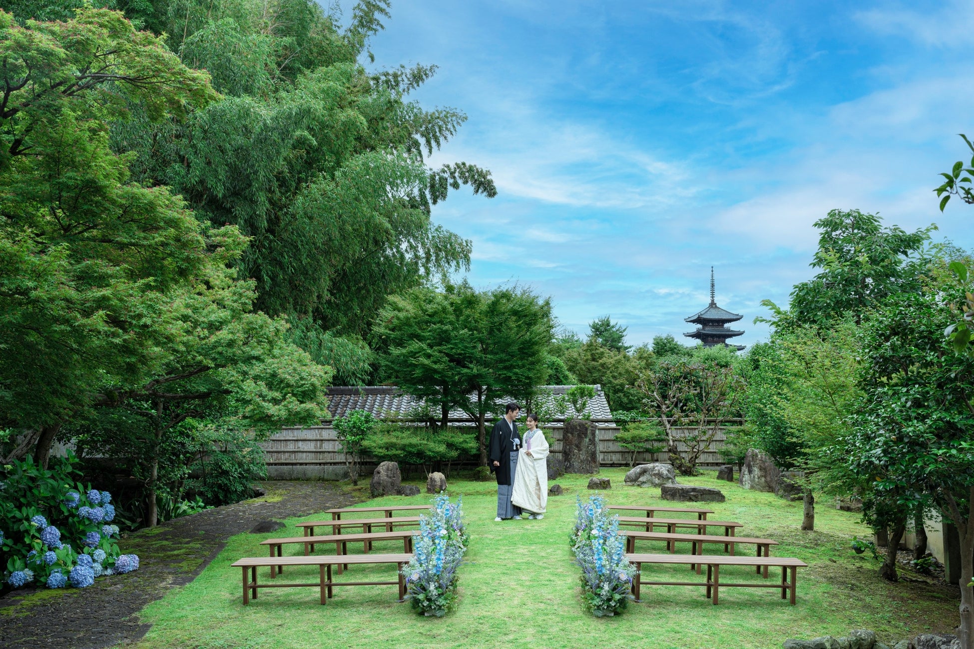 本プランでは、庭園を貸切って、京都の観光名所 八坂の塔をはじめとする東山の眺めを借景にした京都ならではのセレモニーをご提供いたします。