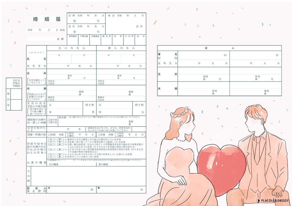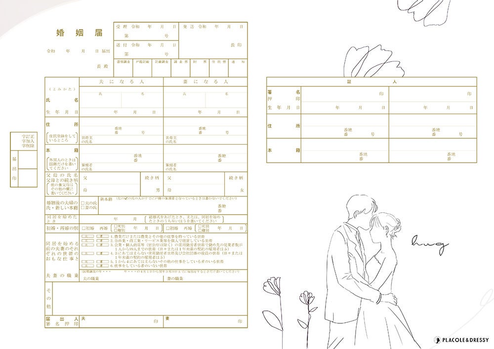 この度、多くの方からお声をいただき、『PLACOLE & DRESSY婚姻届』第11段として待望の新デザインを発表。8月9日『ハグの日』、8月10日『ハート・ハトの日』など8月に入籍をするおふたりへ向けたオリジナルデザインをはじめ、人気の花言葉デザインなど全5種類が登場!今後も季節や時事ネタを盛り込んだオリジナルの婚姻届を描き下ろしでお届けいたします。