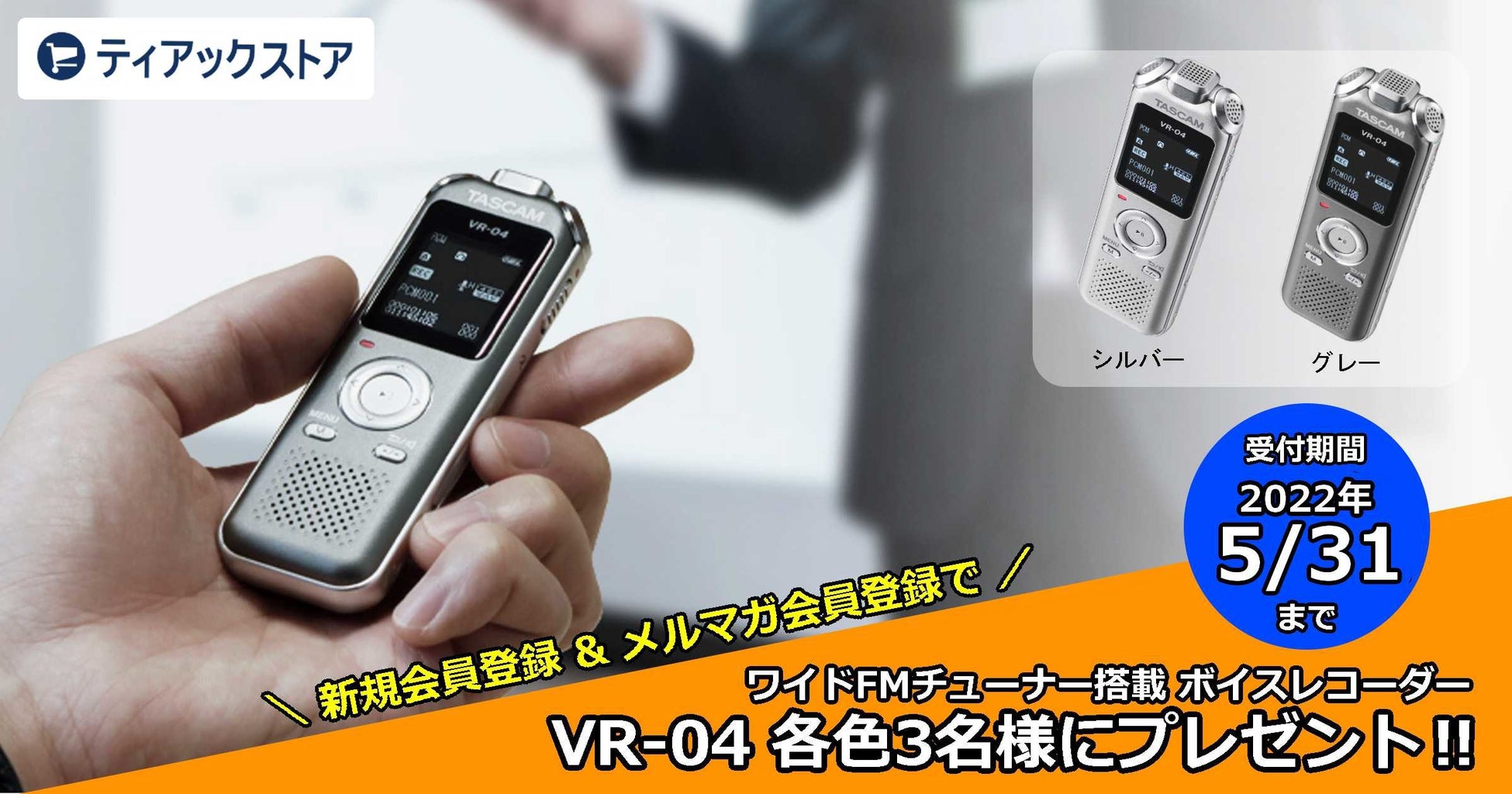 ティアック株式会社が運営する公式オンラインストア「ティアックストア」は、5月1日(日)~5月31(火)の期間中、ティアックストアに新規会員およびメルマガのご登録をいただいたお客様を対象に、抽選で会議からインタビューまで簡単録音可能なボイスレコーダー「VR-04」が当たるプレゼントキャンペーンを実施中です。