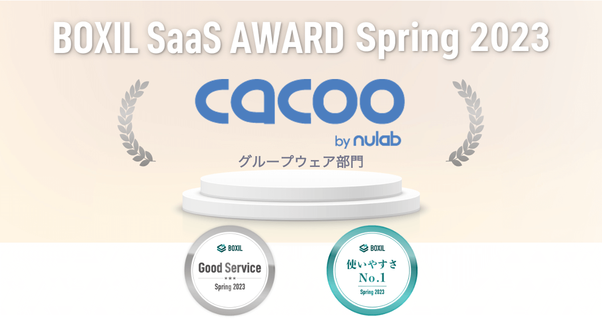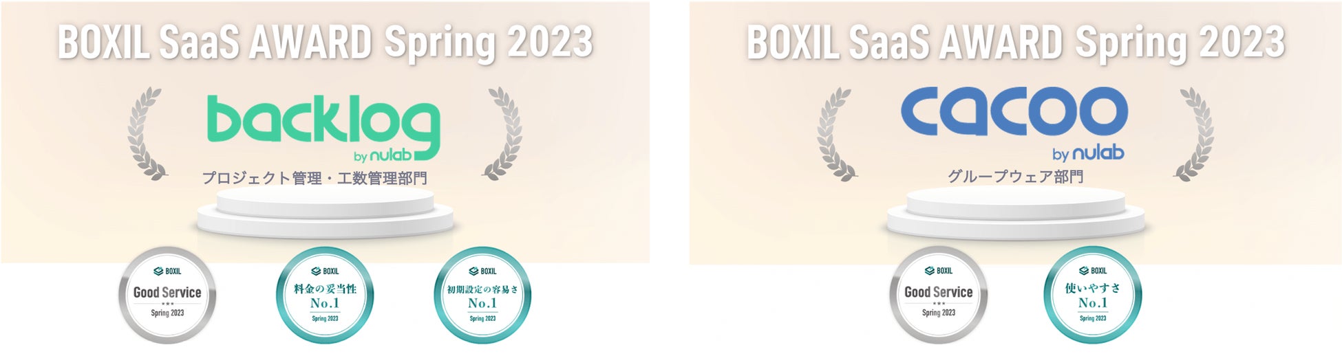 また、同時発表の「BOXIL SaaS AWARD Spring 2023」にて、「Backlog(バックログ)」は、プロジェクト管理・工数管理部門で「Good Service」「料金の妥当性No.1」「初期設定の容易さNo.1」の3項目をで、「Cacoo(カクー)」はグループウェア部門で「Good Service」「使いやすさNo.1」の2項目を受賞しました。
