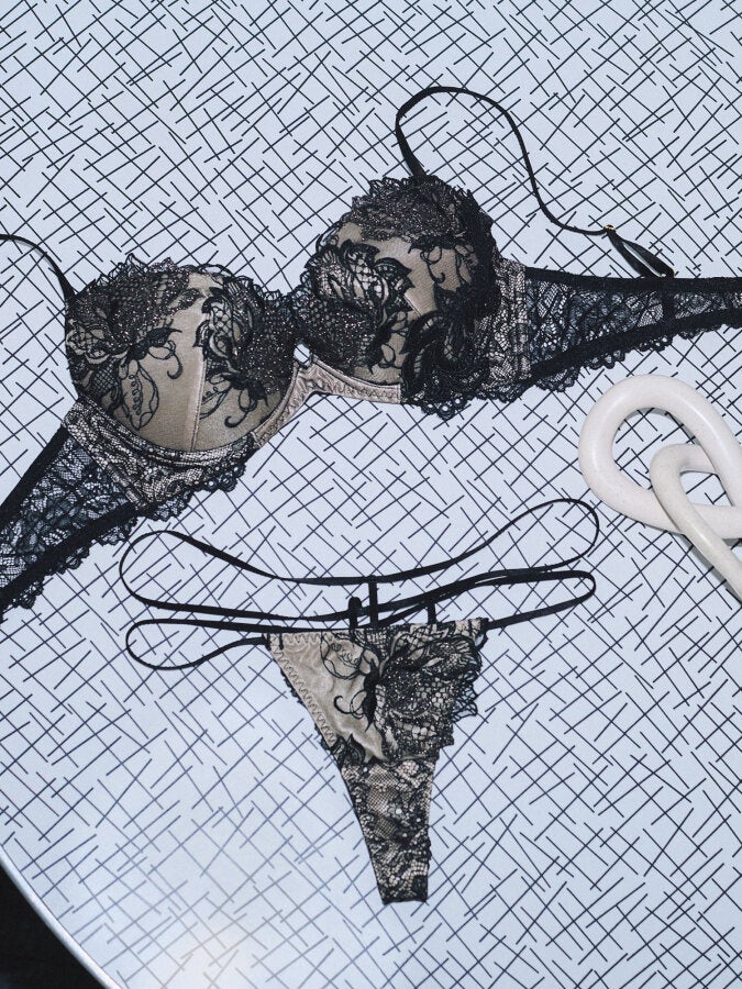 花びらの中にも柄が描かれた繊細なエンブロイダリーレース。カップからこぼれ落ちそうな大きな柄がゴージャス。サイドに配した立体感のある大ぶりのモチーフは、大人の魅力を解き放つセクシーなアクセント。輝き満ちた花びらが美しさを際立たせる。