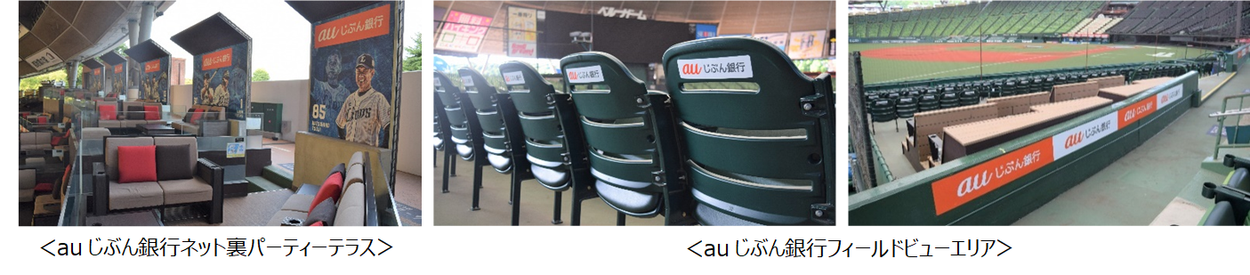 1,3塁側に位置するフィールドビューエリアは、最前列の「フィールドビューフロント」、その後ろの「フィールドビューシート」、後方に位置する「フィールドビューソファ」の3席種があり、グラウンドへの距離も近く、選手とほぼ同じ目線の高さでダイナミックな試合観戦をお楽しみいただけます。ファンの皆さまにも非常にご好評いただいている座席です。本契約により、フィールドビューエリアの入り口やフィールドビューフロントとフィールドビューシートの座席裏、フィールドビューソファのカバーなどにauじぶん銀行の企業ロゴが入ります。