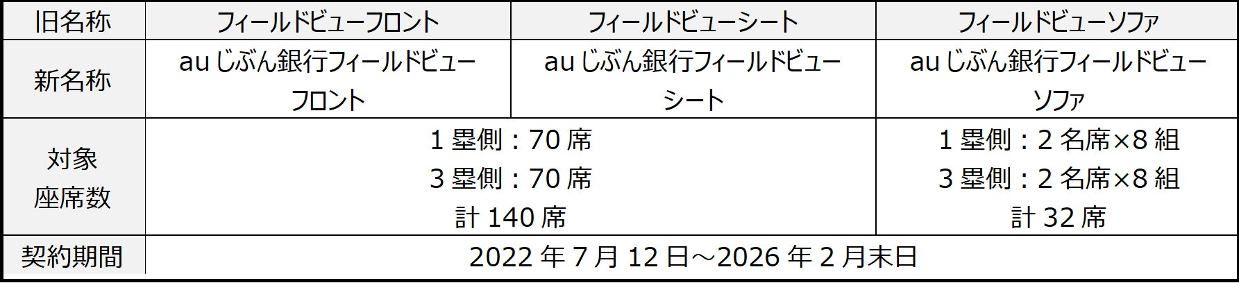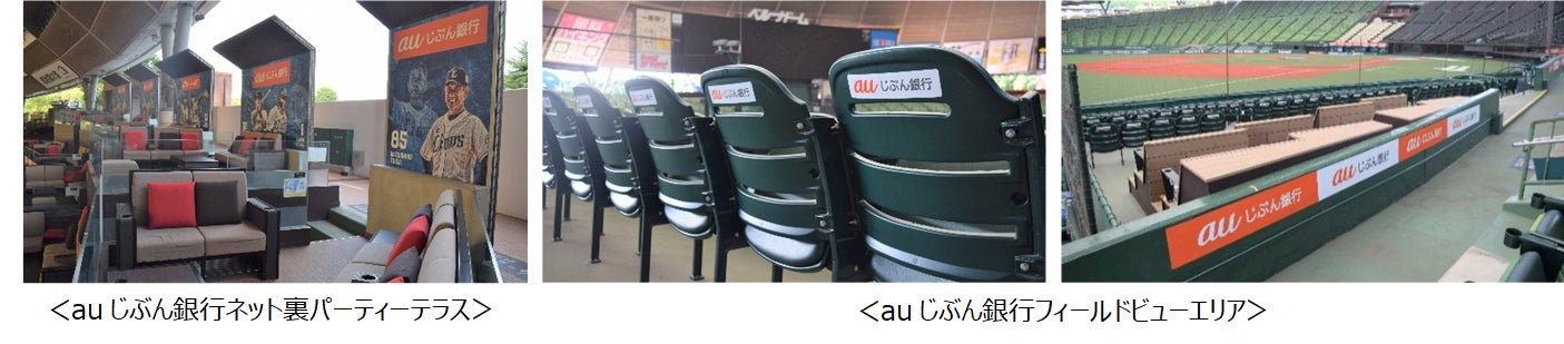 今回の契約締結により、2022年7月12日(火)から、1,3塁側のフィールドビューエリアの座席はそれぞれ『auじぶん銀行フィールドビューフロント』、『auじぶん銀行フィールドビューシート』、『auじぶん銀行フィールドビューソファ』に、ネット裏パーティーテラスは『auじぶん銀行ネット裏パーティーテラス』に名称を変更いたします。なお、auじぶん銀行がベルーナドームの座席の施設命名権を取得し行使するのは今回が初めてで、当該座席に企業の名前が付くのも初めてです。