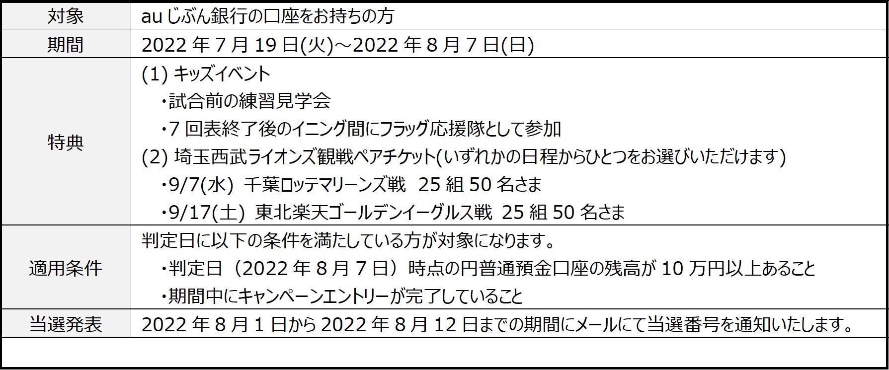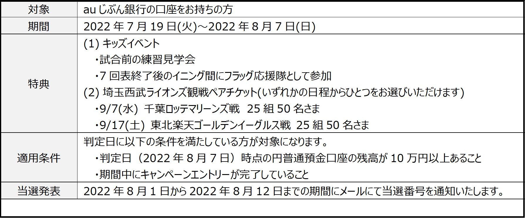 また、auじぶん銀行では2022年7月19日(火)から2022年8月7日(日)までの期間中、ライオンズ戦の観戦親子ペアチケットが50組100名さまに当たる「埼玉西武ライオンズ試合観戦チケット&キッズイベントご招待キャンペーン!」を実施いたします。