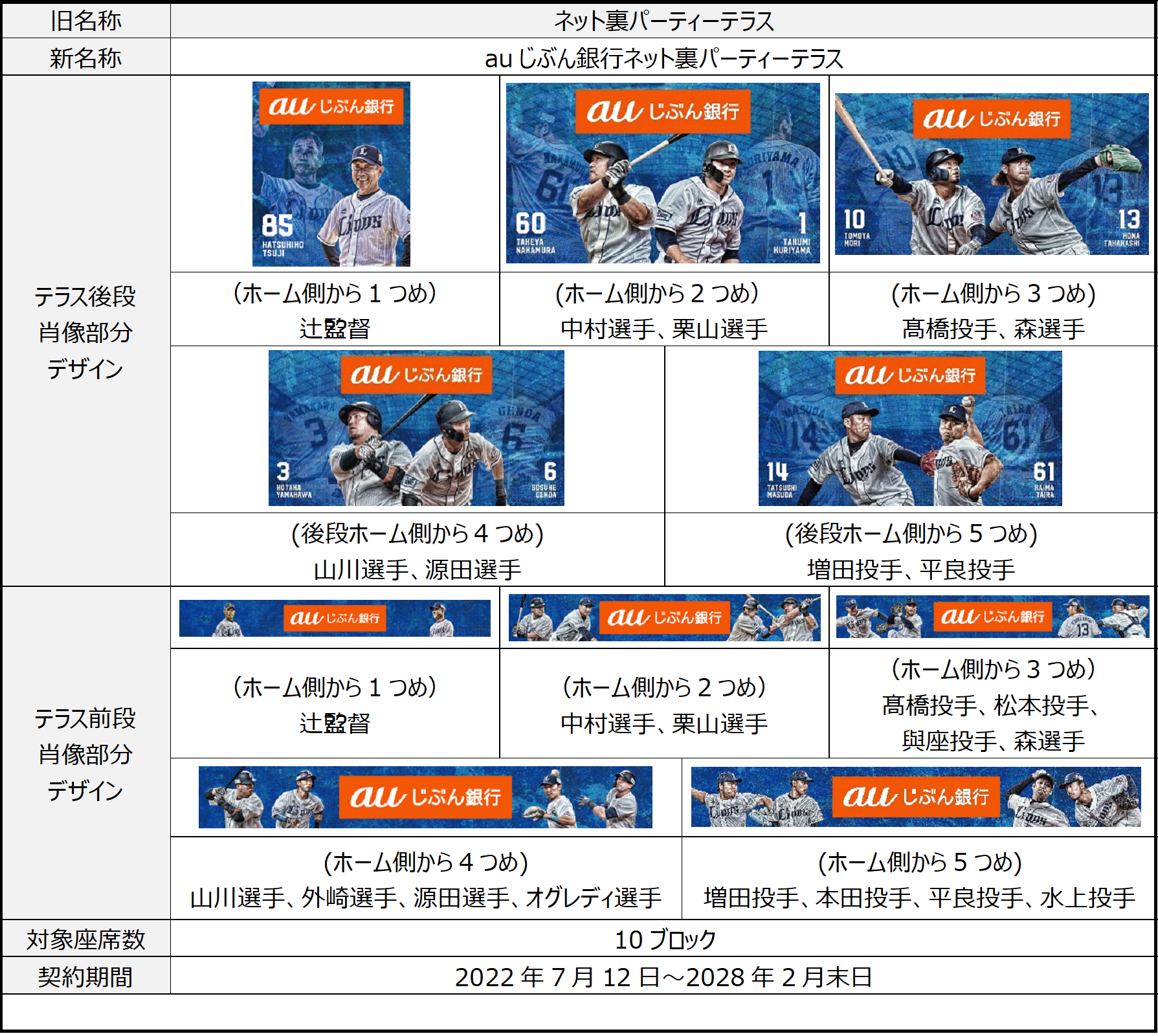 株式会社西武ライオンズ(本社:埼玉県所沢市、代表取締役社長:奥村 剛、以下「西武ライオンズ」)と、auじぶん銀行株式会社(本社:東京都中央区、代表取締役社長:臼井 朋貴、以下「auじぶん銀行」)では、埼玉西武ライオンズの本拠地ベルーナドーム1,3塁側の「フィールドビューエリア」の3席種と、ご家族やご友人などのグループで観戦いただける「ネット裏パーティーテラス」の施設命名権(ネーミングライツ)スポンサー契約を2022年7月11日(月)に締結いたしました。