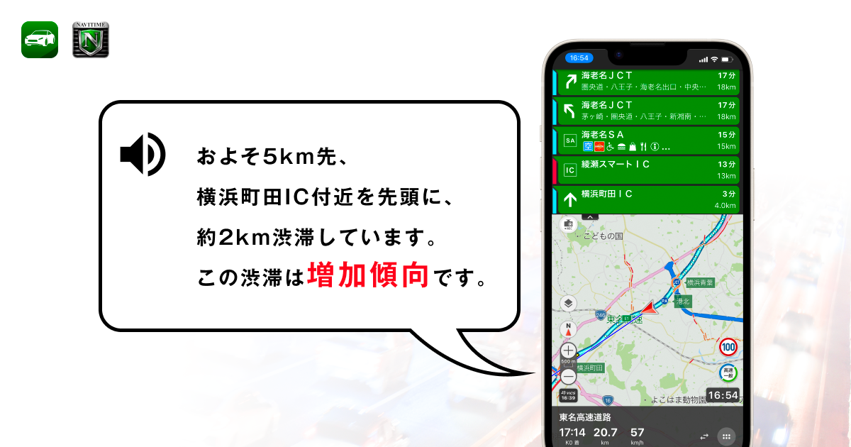 走行中に、直近の渋滞・規制情報に加え、その渋滞の増減傾向について「およそ5km先、横浜町田IC付近を先頭に、約2km渋滞しています。この渋滞は増加傾向です。」のように発話するようになります。