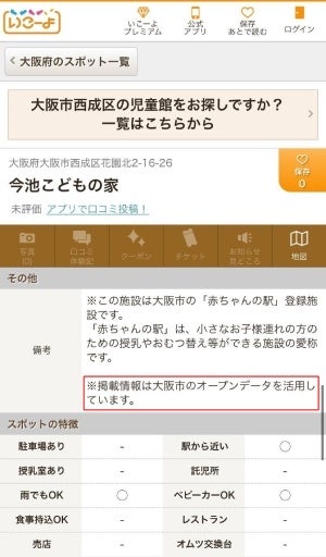 2022年8月より、大阪市の「 子どもとおでかけ向け」 施設のオープンデータを利用しています。データは「いこーよ」 のサイトおよびスマホ向けアプリの「おでかけ」情報欄に掲載され 、 どなたでも無料でサービスをご利用いただけます。 なお 、情報欄にはオープンデータを利用している旨記載されます。 また、データの中には授乳やおむつ替えで利用できる大阪市の子育て施策「赤ちゃんの駅」の情報も掲載しています。施策の施設には「赤ちゃんの駅」であることも記載されています。