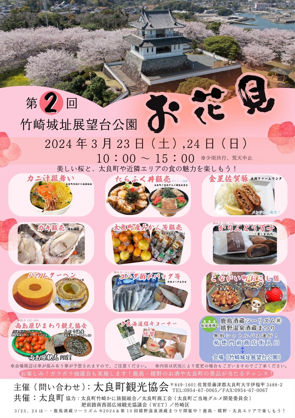 太良町は、2024(令和6)年3月23日(土)24日(日)の10時から15時に、有明海の大パノラマを望み、美しい桜並木が広がる、竹崎城址展望台公園にて昨年に引き続きお花見イベントを開催し皆様をお迎えいたします!
